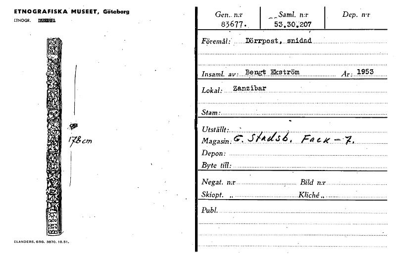 • ETNOGRAFISKA MUSEET, Göteborg ETNOGR. ~3, ELANDERS. GBG. 3870. 10.51. Insaml. av • Bengt Ekström Ar: 1953 Lokal: Zanzibar Stam: Utställt: Magasin: J Fa e. k --1Å Depon• Byte till: Negat. n:r Bil... Visa hela