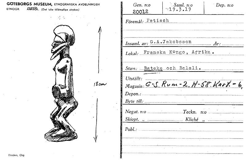 • GOTEBORGS MUSEUM, ETNOGRAFISKA AVDELNINGEN ETNOGR. argtl. (Det icke tillämpliga strykas) Gen. n:o 20012 Saml. mo 19 .3 .19 Dep. n:o Föremål: Fetisch Igc", 'Jakobs Insaml. av: G°A° son Lokal: Franska... Visa hela