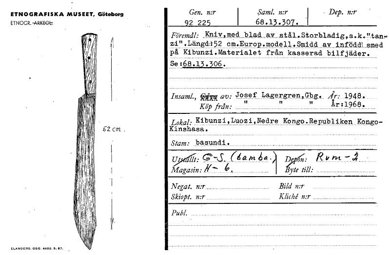 • ETNOGRAFISKA MUSEET, Göteborg ETNOGR.-~-. Gen. n:r I Sand. n:r I • Dep. n:r 92 225 I 68.13.307. Föremål: Kniv, med blad av e tål..S.t.o.rbla.dig.,.s..k. "tant al" . Längd.: 52 cm. .Europ .modell . S... Visa hela