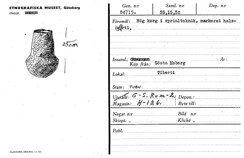 • ETNOGRAFISKA MUSEET, Göteborg ETNOGR. Rean Gen. n:r I Saml. n:r 84715. I 55.15.52 Dep. n:r Föremål: Hög korg i aprialteknik, markerat hals- ti. Insaml„ M31~1221 • År: Köp från: Crosta Moberg Lokal: ... Visa hela