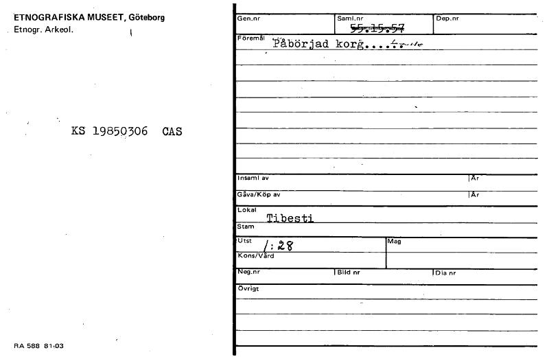 • ETNOGRAFISKA MUSEET, Göteborg Etnogr. Arkeol. KS 19850306 OAS RA 588 81,03 Gen.nr Saml.nr 5.9'~ Dep.nr Föremål — Påbörjad korg Insaml av IÅr Gåva/Köp av I År Lokal Tibesti Stam Utst i . 2 v Mag Kons/V... Visa hela