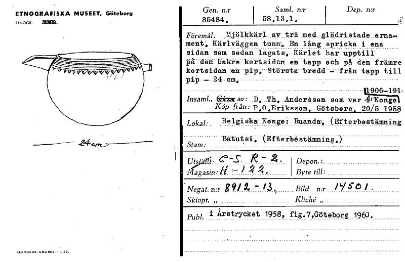 ETNOGRAFISKA MUSEET, Göteborg ETNOGR. 283tak. ELANDERS. 0E10 502. 11. 53. Gen. n:r 85484. Sam!. n:r I 58.13,1. i Dep. n:r . Föremål: Mjölkkärl av trä med. glödristad.e...orna,!. ment, Kärlväggen tunn-, En lång spricka i ena sidan som sedan lagats-. Kärlet har upptill på den bakre kortsidan en tapp och på den främr• -kortsidan -en -pip. Största -bredd — från tapp tir pip, — -24 ,cm, 1900-191 Insaml., Qiizac av : ..D...Th,...Anderå son—som-var rKongo Köp 'från: p,0 „Eriksson. Göteborg. 20/5 l95E Lokal: Belgiska- Kongo: Ruanda, (Efterbestämnink Batutsi. (Efterbestämning.) Stam : 9t.ä.11: --S. R - -R • Depon.: Magasin: 11 '--- 2 -. 2 , Byte till: Negat. n:r g g 1 2., — i 3 Bild n:r Pi 5- C) I . Skiopt. „ Kliché „ i Pub!. Årstrycket 19589 fig.7,Göteborg 196). . - [ocr]