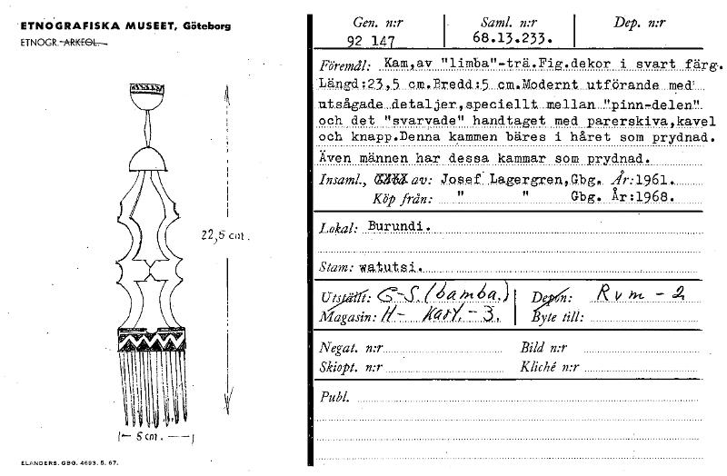 ETNOGRAFISKA MUSEET, Göteborg ETN OG R.-A-R-K-E96-- 22)5 Sm ELANDERS.GBG.4693.5.67. Gen. n:r 92 147 . SamL n:r i 68.13.233. Dep. n:r 1 Föreindh Kam,av 'limba"-trä.Fig.dekor i svart fä] 'Längd:23,5 cm,Breddi5 cm.Modernt utförande_macU, .utBågade_dataljar„speciellt_mellan "pinn,delen och det "svarvade" handtaget med parerskiva,kav( och knapp.Denna kammen bäres i håret som prydnai Även männen har dessa kammar som prydnad. InsamL, (1CUI av: Josef. Lagergren,.Gb.g.. ir:1961.. Köp från: '' n Gbg. År:1968. Lokal: Burundi. Stam: watut si, D)% /e 4/ Magasin: gs- koi-- 3 i yte till: Negat. n:r Bild n:r Skiopt. n:r Kliché n:r PubL g. [ocr]