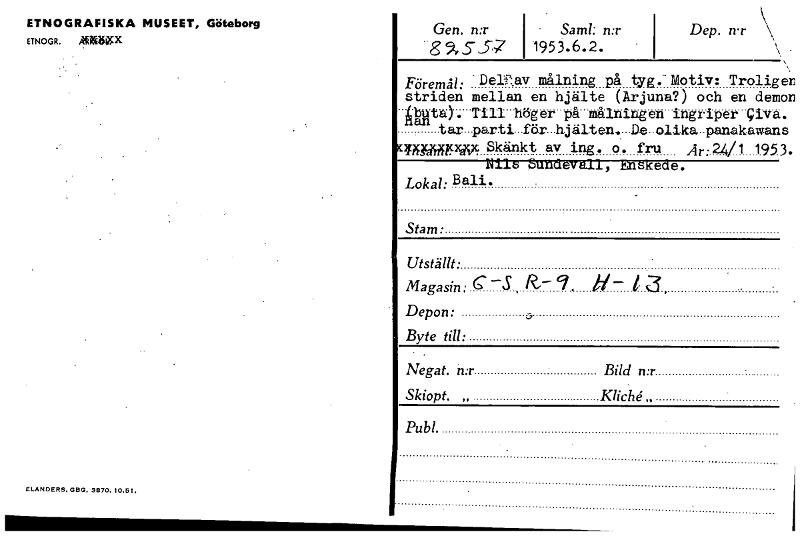 ETNOGRAFISKA MUSEET, Göteborg ETNOGR. ARMÖXX 9).Gen. n:r • Samt: n:r Dep. nrg5 57 1953.6.2. Föremål: Delnav målning på tyg. Motiv: Troligen striden mellan en hjälte (Arjuna?) och en demon Algra). TiIi-höger på målningen ingriper Qiva. . tar parti för_hjälten.-De-olika-panakawans pgårgpsw Skänkt av ing. o. fru ,4r.24/1 1953. ELANDERS, GBG. 3870. 10.51. - - e e. Lokal: Beli• Stam: Utställt: Magasin: C —S , 1/ Depon: Byte till: Negat. n:r Bild n:r Skiopt. „ Kliché.. Publ. [ocr]Stäng