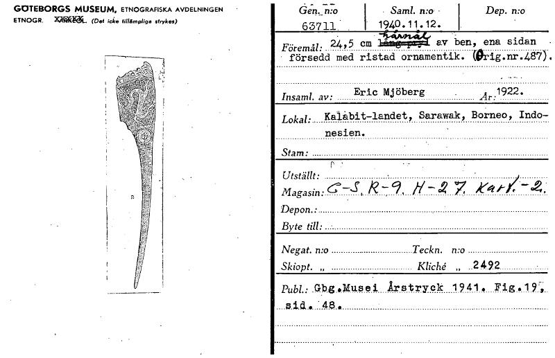 GOTEBORGS MUSEUM, ETNOGRAFISKA AVDELNINGEN ETNOGR. XWRWL. (Det icke tillämpliga strykes) din 5; 63711 . • SamL • 1940.11.12. Dep. mo Föremål: 24,5 em av ben, ena sidan • försedd med ristad ornamentik. (Ørig.nr.487). Insaml. av: Eric Mjöberg 922. Lokal: Kalabit-landet, Sarawak, Borneo, Indo- nesien. Stam: Utställt: Magasin: IV— Depon.: Byte till: Negat. n:o Teckn. n:o Skiopt. „ Kliché „ 2 49 2 Publ.: Gbg4Musei Årstryck 1941. Fig.19',. [ocr]