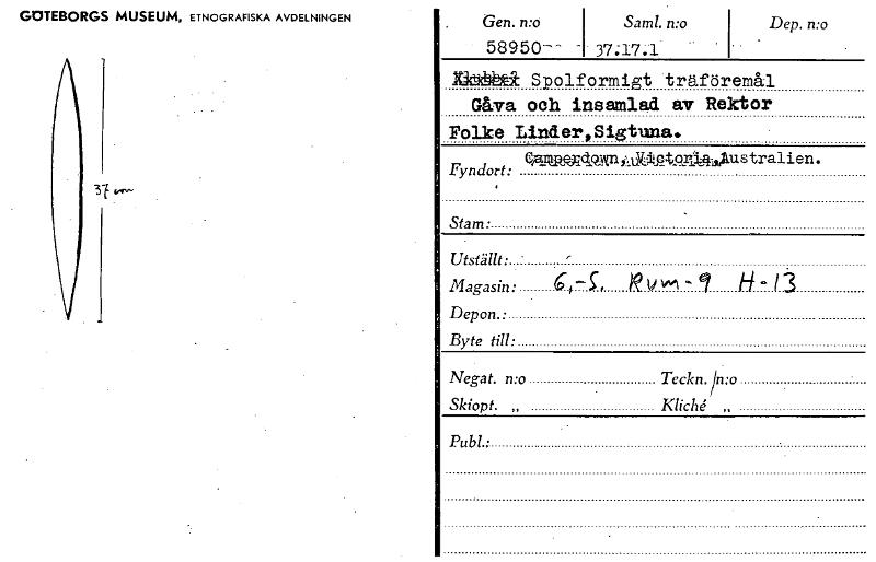 • GOTEBORGS MUSEUM, ETNOGRAFISKA AVDELNINGEN Gen. n:o Saml. n:o 58950-- 37.17.1 Mettel Spolformigt träföremål Gåva och insamlad av Rektor Folke Linder, Sigtuna. Dep. n:o eiarlikqKdonnietctpluAustralien.... Visa hela