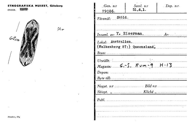 • ETNOGRAFISKA MUSEET, Göteborg ETNOGR. MR1122 _ Gen. n:r 79086. Saml. n:r 51.4.1. . Dep. n:r. Föremål: Sköld. Insaml. av: y• Eiserman. Är: Lokal: Australien, (Falkenberg 57:) Queensland'. Stam: Utst... Visa hela