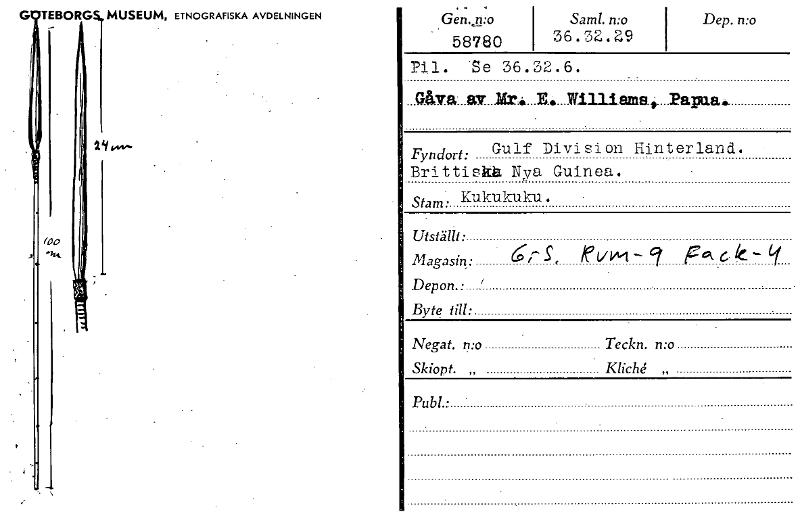 • G • TEBORGS. MUSEUM, ETNOGRAFISKA AVDELNINGEN tOo Gen.n:o I Saml. n:o 58780 36.32.29 Pil. Se 36.32.6. Papua.. Fyndort: Gult Division Hinterland. Brittisk ta Nya Guinea. Dep. n:o Stam; Kukukuku. Utstä... Visa hela