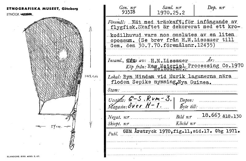 • ETNOGRAFISKA MUSEET, Göteborg ETNOGR.~. ELANDERS. 063. 4693. 5. 67. 142cin Gen: n:r 93518 i Sand. n:r 1970.25.2 1 Dep. n:r Fömmih_Nät_med .trääkaft;.för infångande av flygfisk.Skaftet är dekorerat me... Visa hela