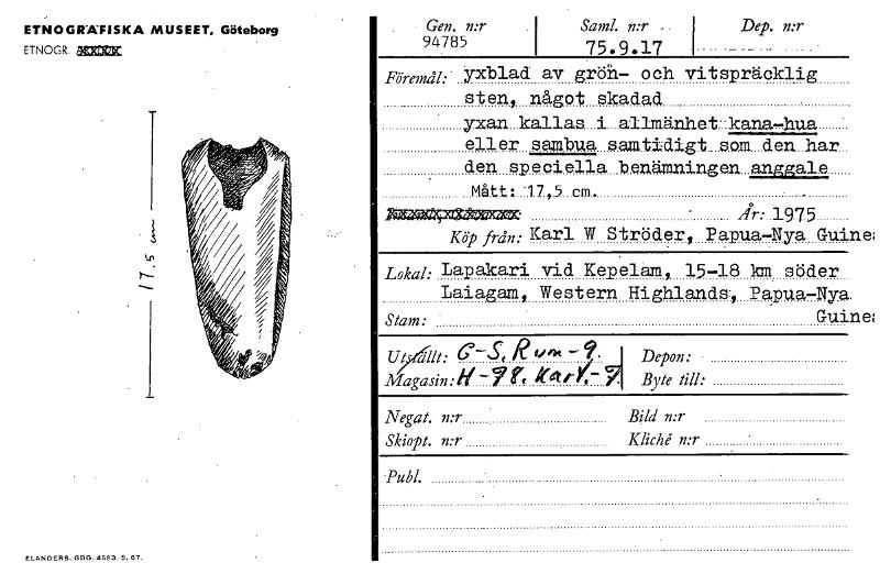 • ETNOGRAFISKA MUSEET, Göteborg ETNOGR. 4 4M Gen. 94785 EV. mr m r Saml. 77.1" — 75.9.17 . Föremd/:. yxblad av gröh- och vitspräcklig sten, något skadad yxan .kallas .i..aIlmänh.et:kana-bua eller sambua... Visa hela