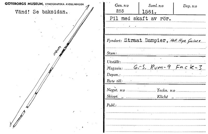 • Dep. n:o Gen. n:o Saml. n:o 255 1561. Utställt. Magasin: Depon.. • Byte till: G,-5, Fek c Pil med skaft av rör. Fyndort: .S.traat....Darnp.ier; 190MN 4 Stam • Negat. n:o Teckn. n:o Skiopt. „ Kliché... Visa hela