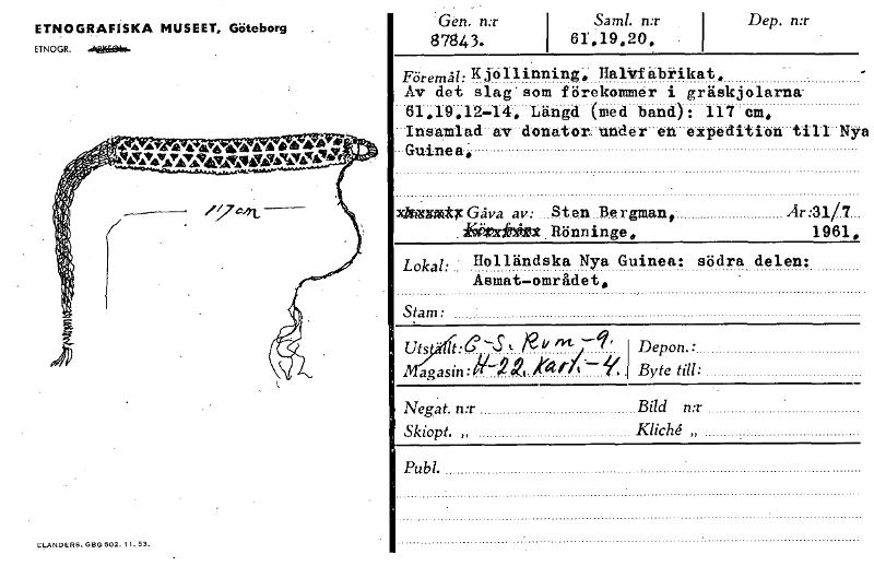 ETNOGRAFISKA MUSEET, Göteborg ETNOGR. Gen. n:r Sam!. tur 87S43. i 61,19,20, Dep. n:r Föremål: Kjollinning, Hand abrikat, Av det slag- som förekommer i gräskjolarna -61,19,12-14:4, Längd (med band): 117 cm, -Insamlad-av-donatur: under en expedition il-I-Nya -Guinea, xlautfidqz G av a av: Sten Bergman,. •.ki4x~x Rönninge. 1961„ Lokal: Holländska Nya Guinea: södra delen: Asmat—området, Stam : uts it:C—S Magasin:N2 ki 4/4 di' Depon.: Byte till: Nega t. n:r Bild n:r Skiopt. „ Publ. ELANDERS. GBG 502. 11. 53. [ocr]