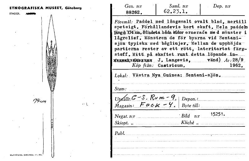 • ETNOGRAFISKA MUSEET, Göteborg ETNOGR. ~OM ELANDERS. 080 502. 11. 53. Gen. n:r 88262. Saml. n:r 1 62.23.1. i . Dep. n:r Föremål: Paddel med långsmalt ovalt blad, nertil: spetsigt. Förhållandevis kort... Visa hela