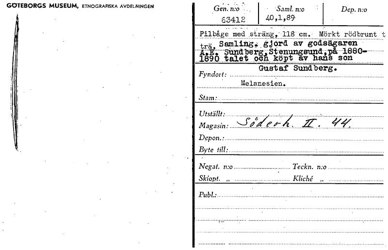 GOTEBORGS MUSEUM, ETNOGRAFISKA AVDELNINGEN G in. n .•-o . .Saml. mo Dep. n:o 63412 1 40,1,89 Pilbåge med sträng, 118 cm. Mörkt rödbrunt t Fyndort: trä Samling:_ gjörd av godsåkaren Sundberg,Stenungsun...