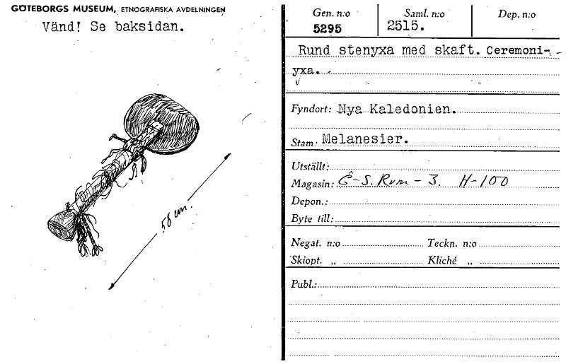 • GOTEBORGS MUSEUM,. ETNOGRAFISKA AVDELNINGEN Vänd! Se baksidan. Gen. n:o - 5295 Saml. n:o 2515. Dep. n:o Rund stenyxa med skaft. ceremoni-. Fyndort:Nya Kaladonien. stam. Melanesier. Utställt Magasin: -... Visa hela