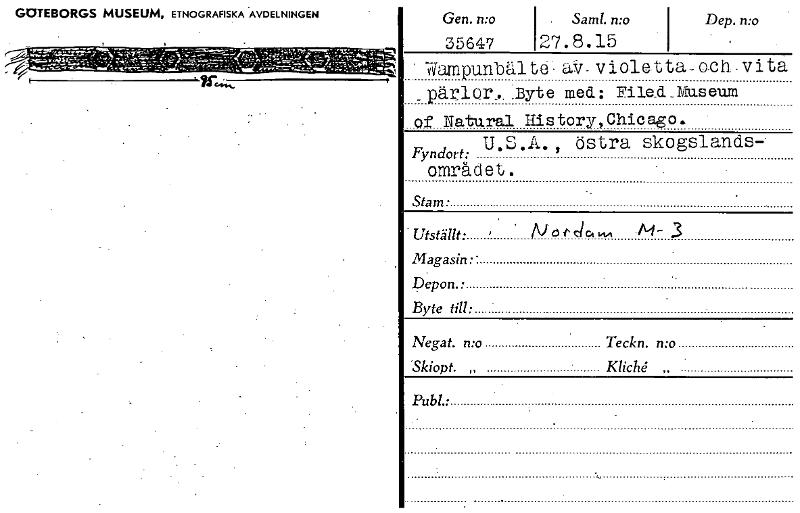 • GÖTEBORGS MUSEUM, ETNOGRAFISKA AVDELNINGEN Gen. n:o . Samt. n:o Dep. n:o 35647 27.8.15 Warnpunbäl a.V- violetta- och - vita _pärlor. Byte med: FileA_Museum of Natural History,Chicago. Fyndort: USA" ö... Visa hela