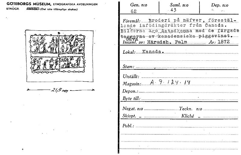 GOTEBORGS MUSEUM, ETNOGRAFISKA AVDELNINGEN ETNOGR. Ma= (Det icke tillämpliga strykas) Gen. n:o 62 Saml. n:o .43 Dep. n:o :. Föremål: nroderi på nä.fver, förestäl- 18nde infödingdräkter från Canada. B...