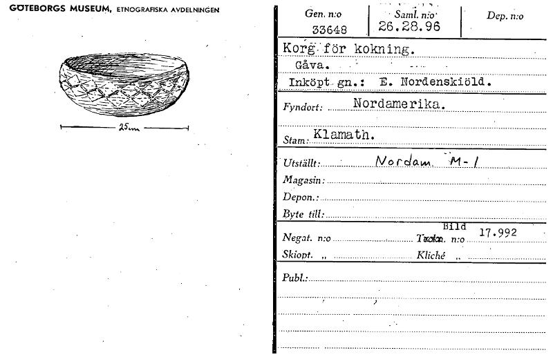 • GOTEBORGS MUSEUM, ETNOGRAFISKA AVDELNINGEN Gen. n:o Saml. 33648 26. 28.96 Dep. n:o Kort-•f ör kokning. Giva. Inköpt gn.: E. Nordenskiöld. Fyndort: Nordamerika. Stam Klamath. Utställt: Mor dam. Maga... Visa hela