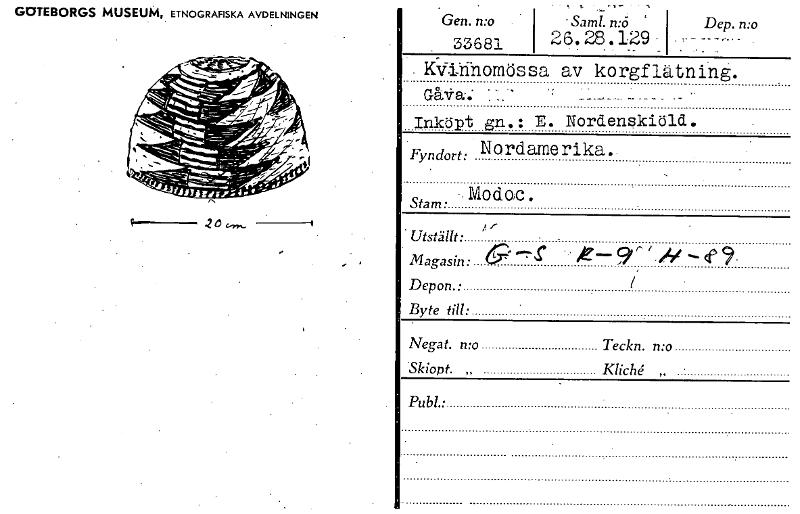 • GOTEBORGS MUSEUM, ETNOGRAFISKA AVDELNINGEN Gen. n:o Sami. n:_o" Dep. n:o 33681 26.28.129 - - KVIiin om ö s sa av korgflätning. Gava. „ Inköpt en.: E. Nordenskiöld. Fyndort: Nordamerika. Mo d oe Stam ... Visa hela