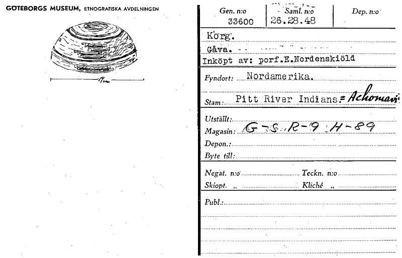 • GOTEBORGS MUSEUM, ETNOGRAFISKA AVDELNINGEN Gen. n:o 33600 Gåva. - - Inköpt av: porf;E,Nordenskiöld Fyndort: Nordamerika. Samt. n:o Dep. n:o 26.28.48 Stam: Pitt River Indi an Utställt: Magasin: Depon... Visa hela