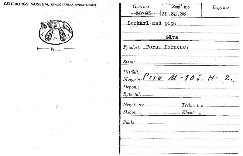 • GOTEBORGS MUSEUM, ETNOGRAFISKA AVDELNINGEN Gen. n:o —5'6785- 35-;.32. Dep. n:o I, e rktlx.1.. med, pi p • Gäva Fyndort: ...P.eru Tar.ae a . Stam: Utställt: Magasin: Depon.• Byte till: erv Negat. n:o ... Visa hela
