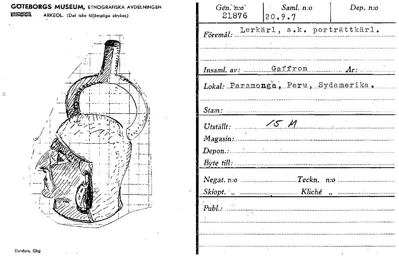 GOTEBORGS MUSEUM, ETNOGRAFISKA AVDELNINGEN eilrffl.. ARKEOL. (Det icke tillämpliga strykas) Elanders, Gbg Geb: -mo' 21876 Saml. n:o 20. 9 ,, 7 Dep. n:o Lerkiarl , s.k. porträttkärl. Föremål: . Insaml....