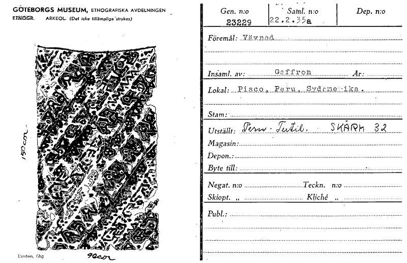 • GÖTEBORGS MUSEUM, ETNOGRAFISKA AVDELNINGEN ET.~. ARKEOL. (Det icke tillämpliga 'strykes) Gen. n:o 23229 • Sainl: n:o 22.2.35a Dep. n:o Föremål: V.. yr. lind Ins'aml. av: Gaffron Är • Lokal: Pisco P... Visa hela