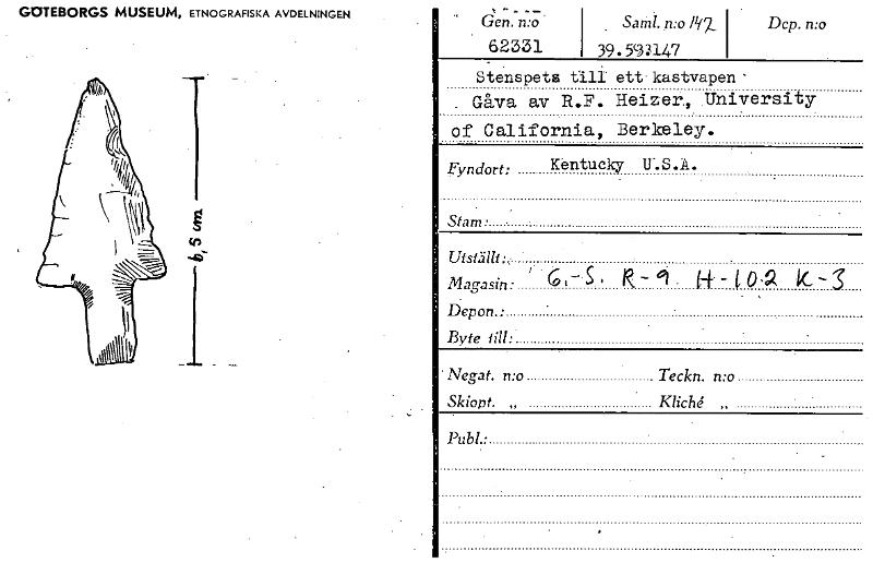• GOTEBORGS MUSEUM, ETNOGRAFISKA AVDELNINGEN Gen. n:o 62331 Saha. n:o 39. 593147 Dcp. n:o 1 Stenspets till ett-kastvapen Gåva av R.F. Heizer, University of California, Berkeley. Fyndort: Kentucky U.S.A.... Visa hela