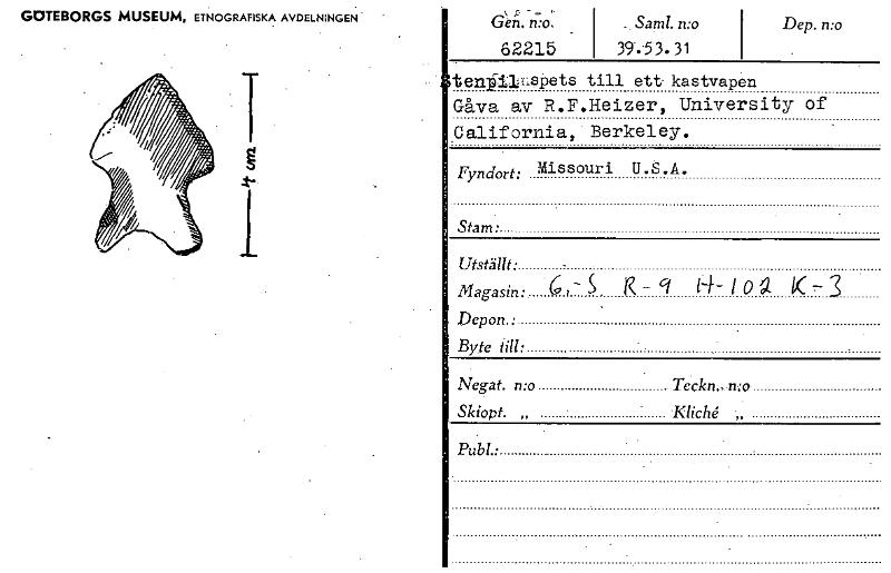 • GOTEBORGS MUSEUM, ETNOGRAFISKA AVDELNINGEN Gen. n:o. Saml. n:o 62215 39.53.31 Dep. n:o ten15-1 spets till ett kastvapen Gåva av R.F.Heizer, University of California, Berkeley. Fyndort: Missouri U.S.A... Visa hela
