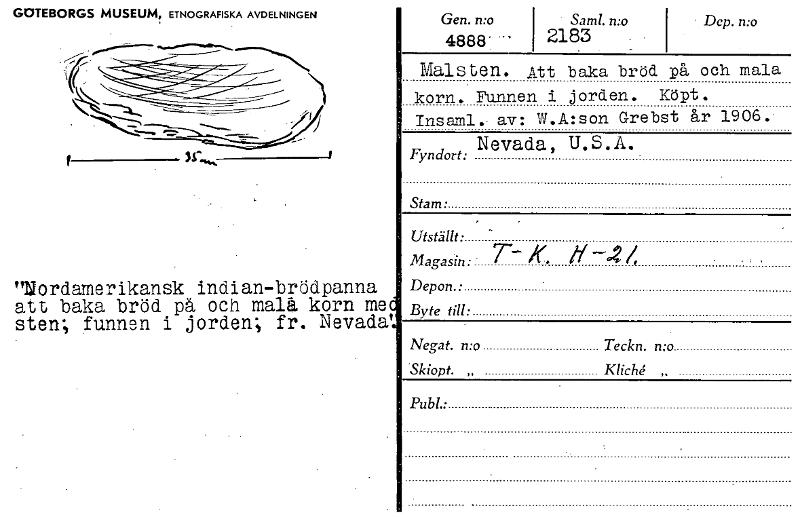 • GOTEBORGS MUSEUM, ETNOGRAFISKA AVDELNINGEN "Nordamerikansk indian-brödpanna att baka bröd på och mal& korn me sten; funnen i jorden; fr. Nevada • Dep. n:o Malsten. Att baka bröd på och mala korn. Funn... Visa hela