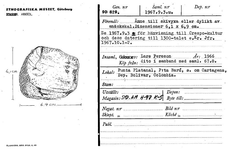 ETNOGRAFISKA MUSEET, Göteborg 5521~. ARKEOL. Gen. mr. Sand. MT . Dep. MT 90) 8294 I . 1967 9 .3 tr.. I Föremål: Ämne till skivyxa eller dylikt. av snäckskalaimensioner' 6,1 x 649 cm. Se 1967,9.3 OP f...
