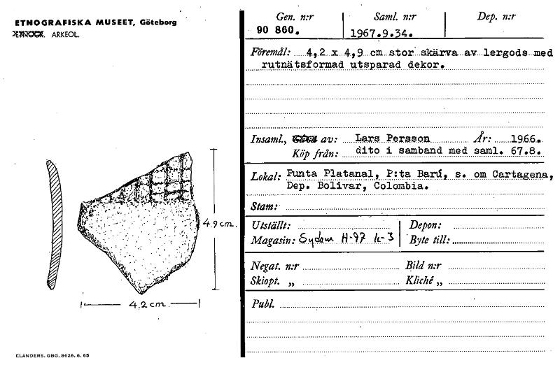 ETNOGRAFISKA MUSEET, Göteborg IMICCX. ARKEOL. Gen. n:r 90 860. ISaml. n:r i 1967.9.34. Dep. n:r Föremål: 4 ,.2.. x...4., .9....cm or...skärva...av...lergods...med rutnätsformad utsparad dekor. 4.2 c n...