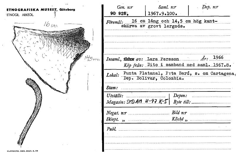 ETNOGRAFISKA MUSEET, Göteborg ETNOGR. ARKEOL. Gen. n:r I Saml. n:r Dep. n:r 90) 926. I 1967.9.100. • Föremål: 16 cm lång och 14,5 cm hög kant- skärva av grovt lergods. Insaml., &kut av: ..I.ars...Pe...