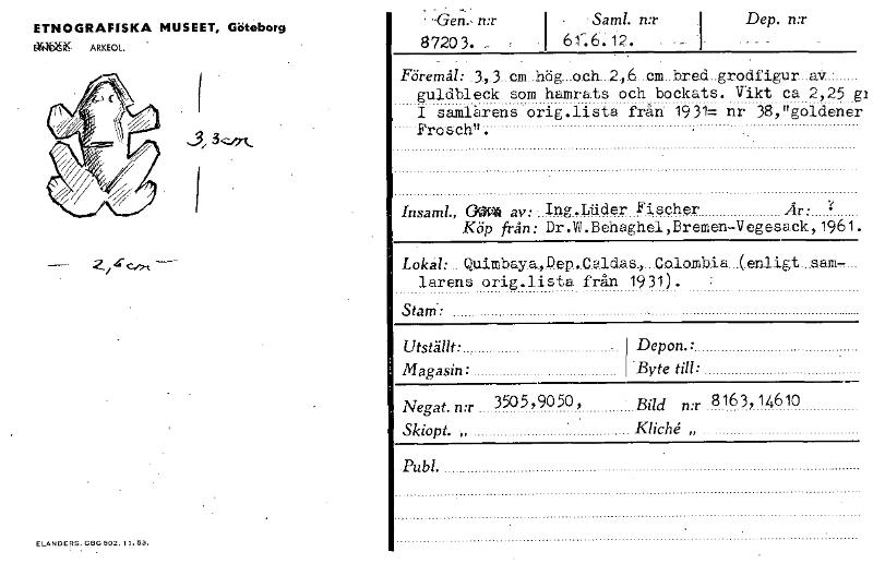 ETNOGRAFISKA MUSEET, Göteborg drb)52P ARKEOL. 1 — ELANDERS. GBG 502. Il. 53. r -Gen.- n:r 87203. _. r I Saml. n:r 1 i 61-.6. 12. Dep. n:r i- _ . . . . Föremål: 3,.3 cm hög...och . 2,6cm bred. grodfigur a..-V- - guldbleck som hamrats och bockats. Vikt ca 2,25 € 1 samlarens orig. lista från 1931= nr 38, "goldenei Frosch". Insaml., Geg§ av: Ing .Liider Fischer År: . Köp från: Dr .Vg .Behaghel ,Bremen-Vegesack., 1961. Lokal:.. Quimbay.a.,Dep...C.aldas., . Colombia (.enligt...sam- larens orig .lista från 19 31) . Stam.: Utställt: Magasin: Depon.: Byte till: Negat. n:r 3505,9050, Bild n:r 8163,14610 Skiopt. „ - Kliché Publ. [ocr]