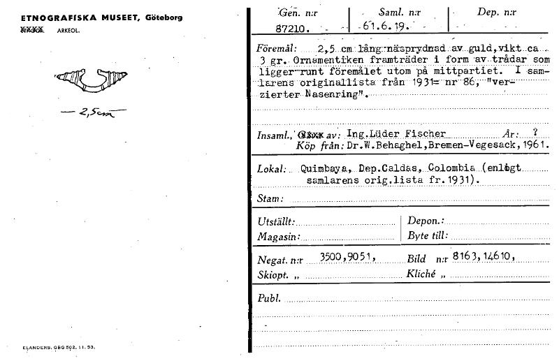 ETNOGRAFISKA MUSEET, Göteborg ARKEOL. ELANDERS GEIG 502. Il. 53. :Geii. n:r 87210. *- --I I . Sam!. n:r - 6-1 • 6- 19••-• - - Dep. n:r - • • - - - _ Föremål: 2,.5...cm.:lån-g7näsprydnad. av _guld, vi...