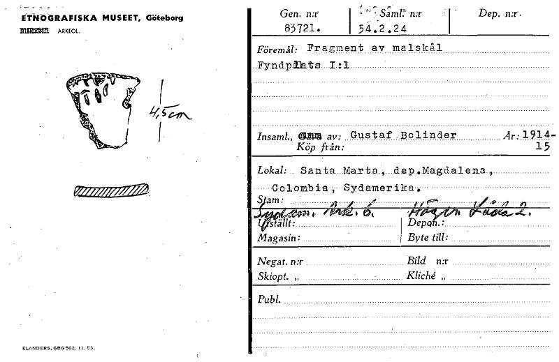 Gen. n:r 83721. Samt: n:r 54.:2„24 Dep. n:r. ETNOGRAFISKA MUSEET, Göteborg 1~ ARKEOL. Föremål: Fragment av malskål .F.ynd.pi]ats Insaml., 0.11111 av: Gustaf Bolinder Köp från: Lokal: Santa Ma.r.t.a....