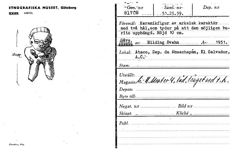 ETNOGRAFISKA MUSEET, Göteborg RWAYG ARKEOL. Dep. n:r "-Gen.-n:r'Sam!.' mr- 817 08 _51.25.59. Föremål: Keramikfigur av arkaisk karaktär med två hål,som tyder på att den möjligen bu- rits upphängd. Höj...