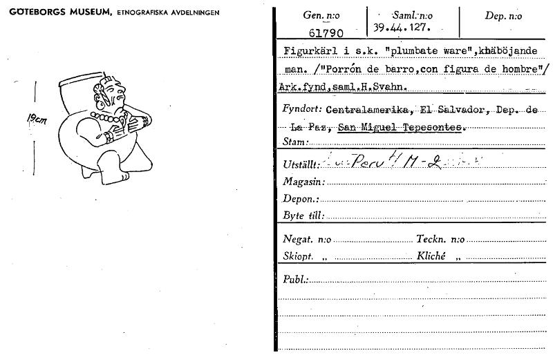 • Dep. n:o • GOTEBORGS MUSEUM, ETNOGRAFISKA AVDELNINGEN Gen. n:o - Sam1.-n:o 61790 39.44 . 127. Figurkärl i s.k. "plumbate ware",khäböjande man. /"Porrön de bärro,con figura de hombre"/ Ark.fynd„saml....