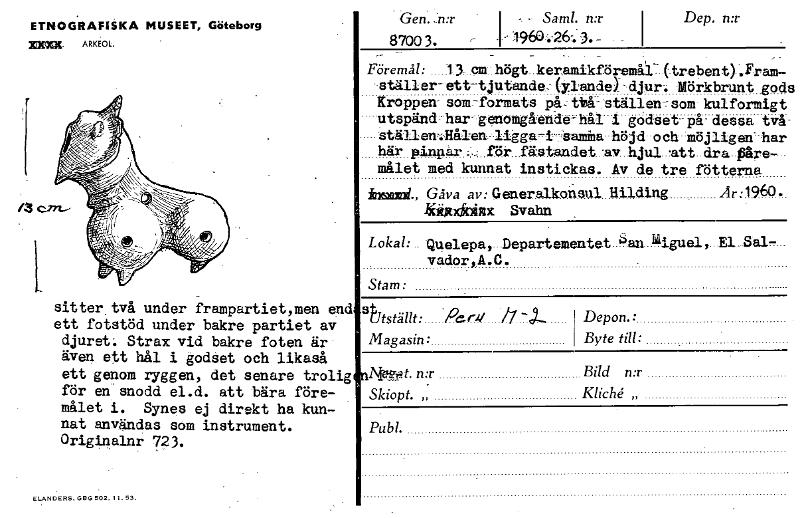 ETNOGRAFISKA MUSEET, Göteborg MEKK ARKEOL sitter två under frampartiet,men end ett fotstöd under bakre partiet av djuret: Strax vid bakre foten är. även ett hål i godset och likaså ett genom ryggen, det senare trolig för ensnodd el.d. att bära före- målet i. Synes ej direkt ha kun- nat användas som instrument. Originalnr 723. ELANDERS. GBG 502. 11. 53. Gen. -n:r Saml. n:r 8700 3. 1--- 1960 r.-267. 3. - Dep. n:r Föremål: 13:. cm högt..keramikföremår (trebent) .Fram- ställer- ett-tjutande= (ylande) - djur-. Mörkbrunt god Kroppen-son-formats på.A14::ställen-lsom kulformigt utspändllar-ggnomgåånde-hål i godset-på-dessa två tällem.Hålewligga7iSamina-höjd-och-'möjligen'har .....har 124414r....för...fäståndet.:av.hjul.att_dra-gre-- målet med kunnat instickas. Av de tre fötterna kargerai., Gåva av: Generalkonsul Hilding Ar:1960. Iii uddro Svahn LokaL_Quelepa,_Departementet San lliguel, El_Sal- vador,A.C. Stam: 36S tällt: På r.4 .. 7..... Depon.: Magasin: Byte till: lat. n:r Bild n:r Skiopt. „ Kliché „ Publ. [ocr]