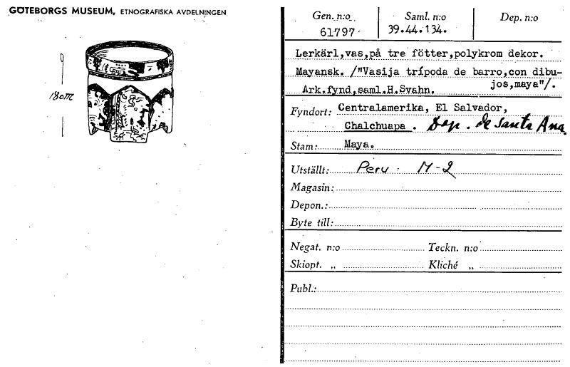 GOTEBORGS MUSEUM, ETNOGRAFISKA AVDELNINGEN /30,7z Gen.p:o_. 61797 ' - Samt. n:o 39.44:134. Dep. n:o Lerkärl,vas,på tre fötter,polykrom dekor. Mayansk. /nasija tripoda de barro,con dibu- jos,mayani. Ark;.. H Svahn, Fyndort: Centralamerika, El Salvador, ' , • Chalchuapa . .14~,4 Stam • Maya. Utställt: Perv , Ci 4 Magasin: Depon.: Byte till: Negat. n:o Teckn. n:o. Skiopt. ,. Kliche Publ:: [ocr]