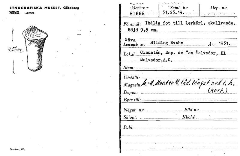h:r Dep. n:r 81668 ETNOGRAFISKA MUSEET, Göteborg W4K4. ARKEOL.El«nders, Föremål: Ihålig fot till lerkärl, skallrande. Höjd 9,5 cm. Gåva hma& av: Hilding Svahn Lokal: Cihuatån, Dep. de 1'an Salvad...