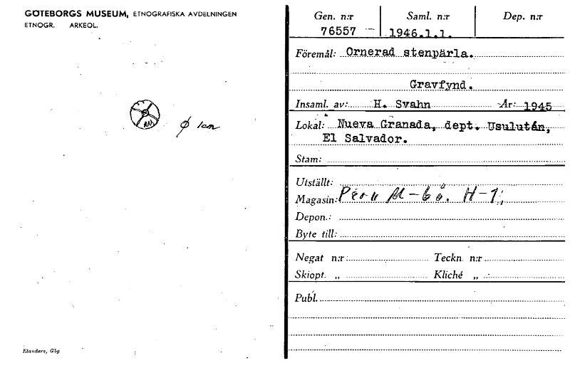 • GOTEBORGS MUSEUM, ETNOGRAFISKA AVDELNINGEN ETNOGR. ARKEOL. G19 Gen. n:r 76557 — Saml. n:r .1946.1_1 _ Dep. n:r Föremål: Ornerad eten.pärla... Gravfynd. Insaml. av: • II.. _Svahn -Ar: 1945 . .. - Lo... Visa hela