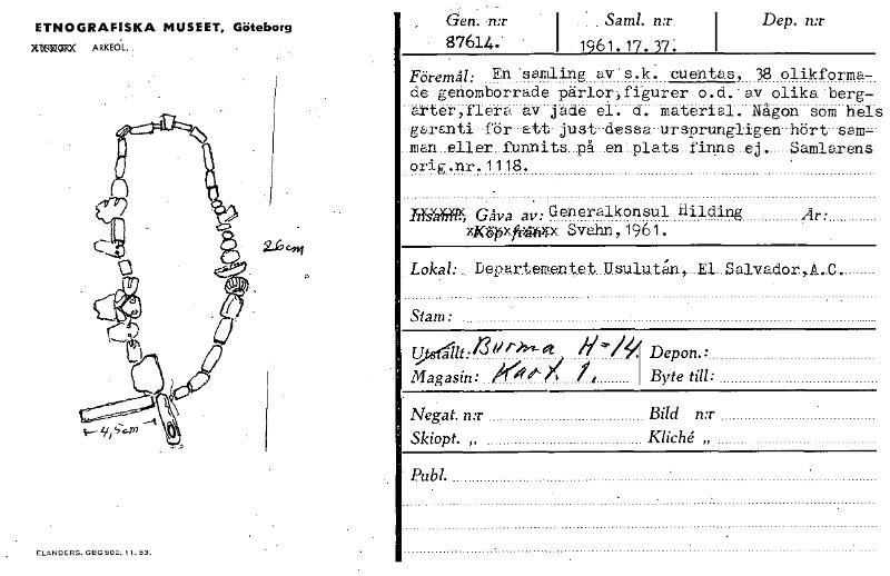 ETNOGRAFISKA MUSEET, Göteborg ~KW AWML ELANDERS. GeG 502. 11. 53. ; Gen: -n:r . - 87614; - I .. Saml. n:r. I 1961.17.37:1 Dep. n:r Föremål: En 'samling de genomborrade arter,flera av jade . 111611 .....
