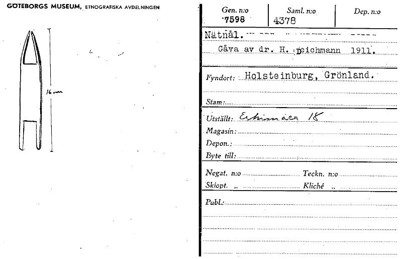 • GOTEBORGS MUSEUM, ETNOGRAFISKA AVDELNINGEN Gen. n:o /598 Sam!. n:o 4378 Dep. n:o -r Gåva av dr. H. ichmann 1911.i Fyndort : Hol s te inburg , Grönland. Stam • Litställt: eJk Magasin: Depon : Byte ti... Visa hela