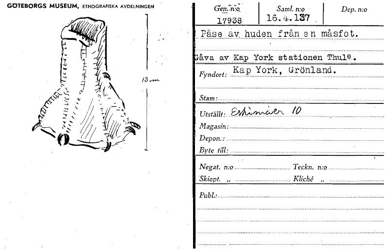 • GOTEBORGS MUSEUM, ETNOGRAFISKA AVDELNINGEN Gen.1.?ci Saml. n:o Dep. n:o 17938 16••137 åse av, huden från en måsfot. åva av Kap York stationen Thule. Fyndort: Kap York, Grönland. Stam • Utställt: a/11... Visa hela