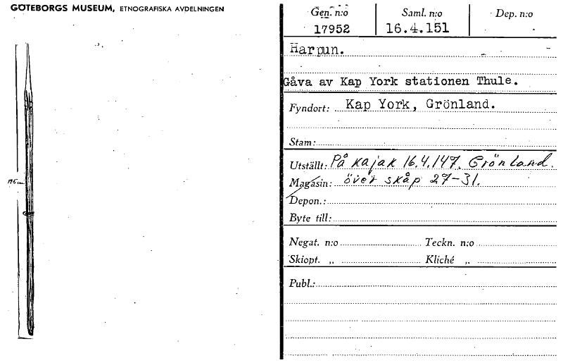 • GOTEBORGS MUSEUM, ETNOGRAFISKA AVDELNINGEN • 17952 Samt. 16.4.161 Gen71;:o7 arpun. • Dep. n:o åva av Kap York stationen Thule . Fyndort: Kap York, Grönland. Stam • Utställt: )(a la Å' /4 ä/7 65:),... Visa hela