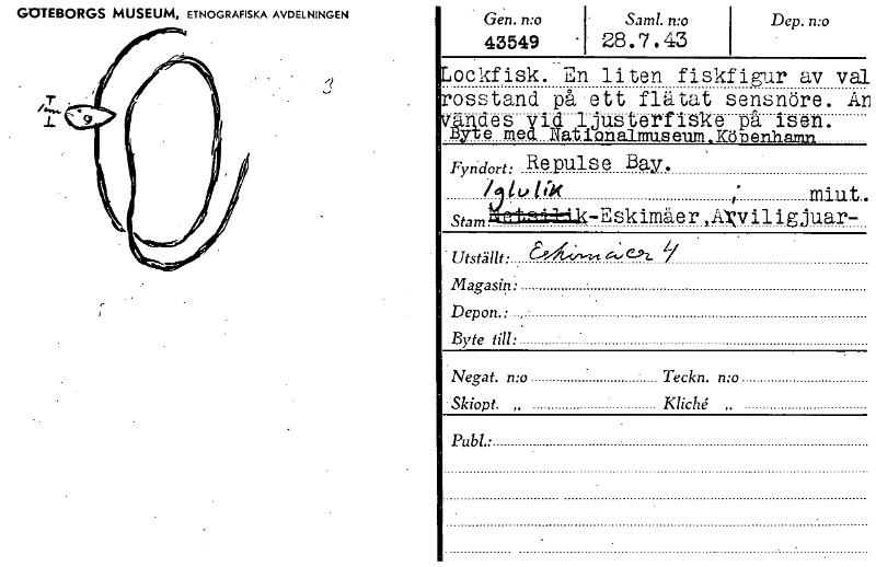 • GOTEBORGS MUSEUM, ETNOGRAFISKA AVDELNINGEN • Gen. n:o 43549 - • Saml. mo 28.7.43 Dep. mo )ockfisk. En liten fiskfigur av val losstand på-ett flätat sensnöre. Ar _a des vid-ijusterfiske på isen. • Byte... Visa hela