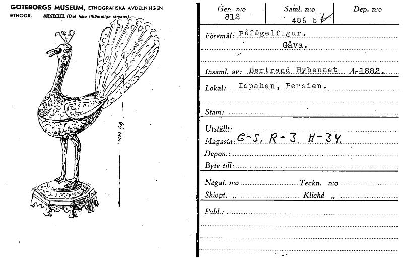 • Sams 1. n:o 486 b Föremål: påfågelfigur. Gåva. Insanil. av: Bertrand Hybennet • Är:18.8.2... Lokal: Ispahan, Persien. Stam: Utställt: Depon.: Byte till: Negat. Teckn. n:o Skiopt. „ Kliché „ Pub... Visa hela