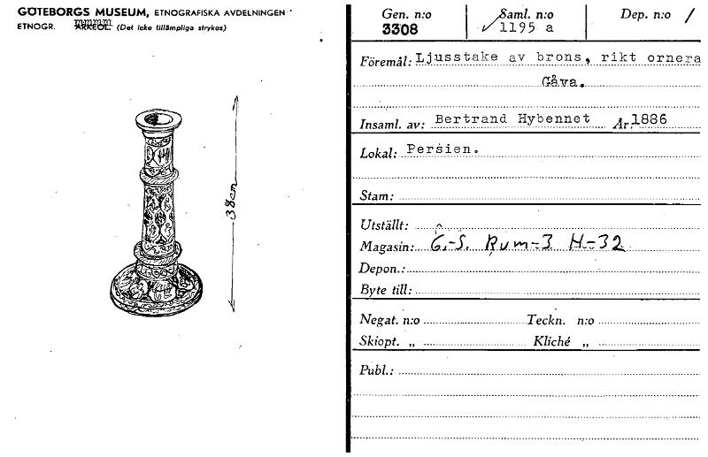 • GOTEBORGS MUSEUM, ETNOGRAFISKA AVDELNINGEN ETNOGR. Wiääl: (Det icke tillämpliga strykes) Gen. n:o 3308 Alt n91.5 n:o a Dep. n:o Föremål:Lj:u.sstake av brons, rikt ornera Gåva. tb d H t Berranyenne In... Visa hela