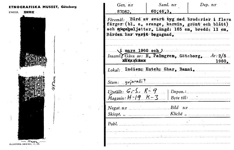 Dep. n:r ETNOGRAFISKA MUSEET, Göteborg ETNOGR. XXODX Gen. n:r Sam!. n:r . 87082. 6046-.3, Föremål: Bård av avart tyg med broderier i flera färger (bl. a. orange, karmin, grönt och blått) och totgekaljetter. Längd: 165 cm, bredd: li cm. Bården har varitbogagnad. mara- 1960-oc-h-) InsamlrGåva av: UD Pailmgreret. dikiprnexinme 1960. Lokal: Indien:: Kutch:: Ghar, Banni. J.• 7 Stam: .Utställt: ‘f--S- Magasin: W-161 k-3 Depon.: Byte till: Negat. n:r Bild n:r Skiopt. „ Kliché Publ. ELANDERS, GBG 502. II. 53. [ocr]